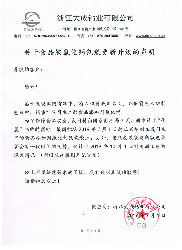 關于食品級氯化鈣包裝更新升級的聲明